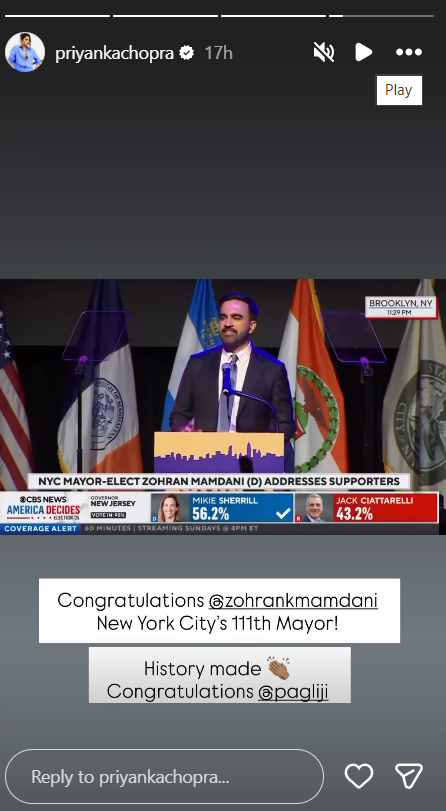 प्रियंका चोपड़ा, जो इन दिनों न्यूयॉर्क में अपने परिवार के साथ रह रही हैं, ने जोहरान की इस उपलब्धि पर अपनी इंस्टाग्राम स्टोरी पर लिखा, “आपने इतिहास रच दिया! यह तो बस शुरुआत है।” उनकी इस पोस्ट के बाद भारतीय और अमेरिकी फैंस दोनों ही सोशल मीडिया पर जोहरान को बधाई दे रहे हैं। फैंस बोले – देसी गर्ल हमेशा अपने देश के लोगों पर गर्व करती हैं प्रियंका के इस कदम की जमकर तारीफ हो रही है। फैंस का कहना है कि प्रियंका जहां भी रहती हैं, भारत से जुड़े लोगों की उपलब्धियों पर हमेशा गर्व जताती हैं। वहीं, जोहरान ममदानी ने भी प्रियंका को धन्यवाद देते हुए कहा कि यह भारतीय समुदाय की एक बड़ी जीत है।